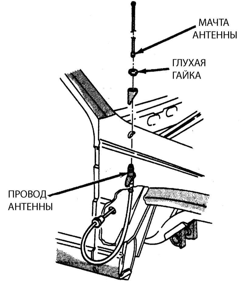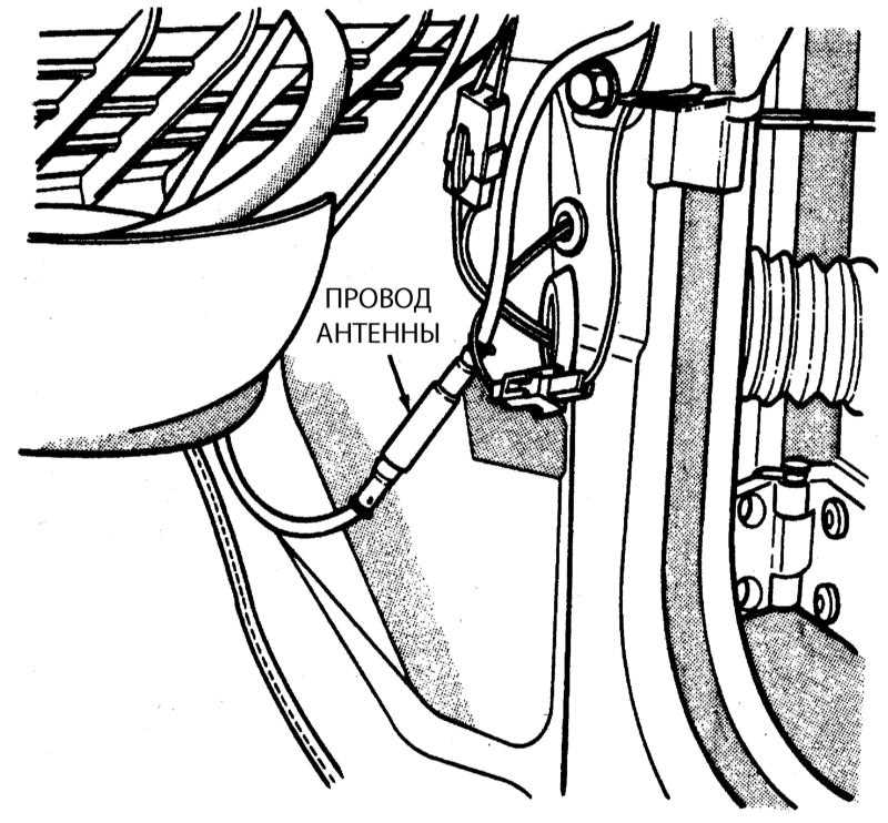 Снимите боковую ударную панель с пассажирской стороны автомобиля и отсоедините провод антенны. Если автомобиль оборудован электроприводной антенной, рассоедините электрический разъем жгута проводов. Извлеките проходную втулку из ударной панели и пропустите сквозь отверстие провод антенны и жгут проводки электропривода.