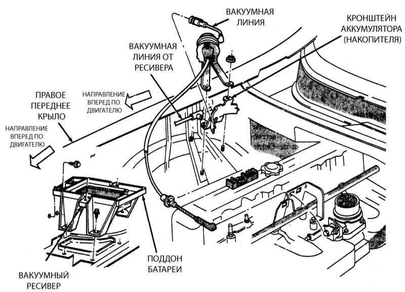 - Визуально осмотрите вакуумные шланги, подсоединенные к сервоприводу и проверьте состояние тяги управления между сервоприводом темпостата и тягой дроссельной заслонки. В случае необходимости произведите замены.