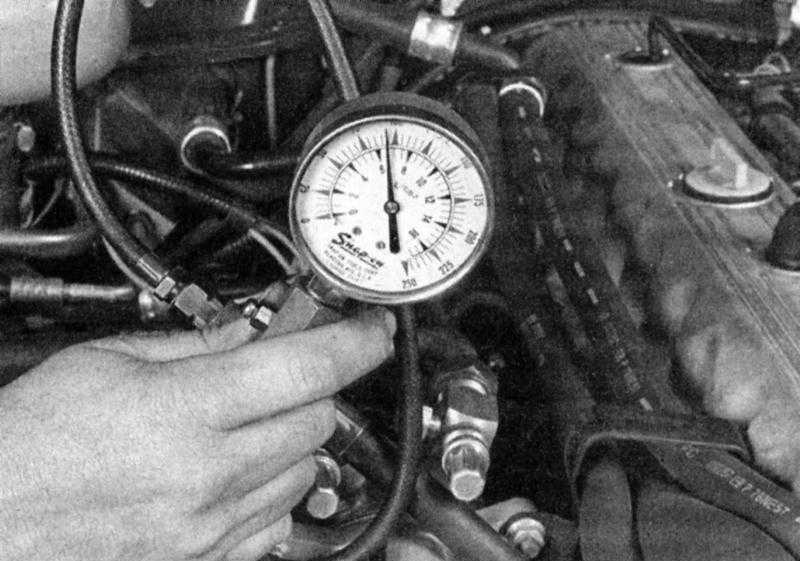 1. Проверните двигатель, проведя поршни как минимум через семь тактов сжатия, считывая показания прибора. Давление в цилиндре исправного двигателя должно подняться быстро. Если низкое давление на первом такте сопровождается постепенным подъемом его в ходе последующих, это свидетельствует о неблагополучном состоянии поршневых колец. Низкое давление на всех тактах говорит об утечках клапанов или дефекте прокладки головки цилиндров (причиной может также являться наличие трещин в литье головки). Часто причиной низкого компрессионного давления оказывается избыточное нагарообразование на тарелках клапанов. Запишите максимальное показание компрессометра.